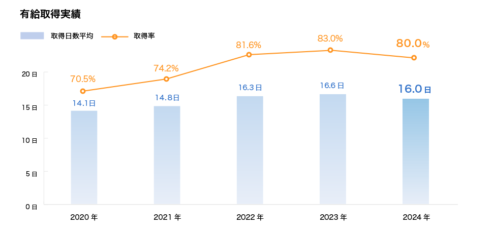 また、有休休暇については、平均取得率80%を労使共通目標とし、2024年度の取得実績は全社平均16.0日(80.0%)でした