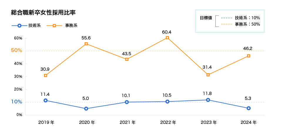 また、女性総合職の新卒採用実績は、事務系66.7%、技術系11.0%となりました。