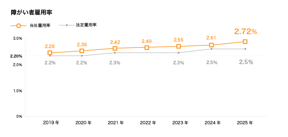 また、当社グループの雇用率は、2025年4月時点で2.72%です。今後も引き続き積極的な雇用を推進していきます。
