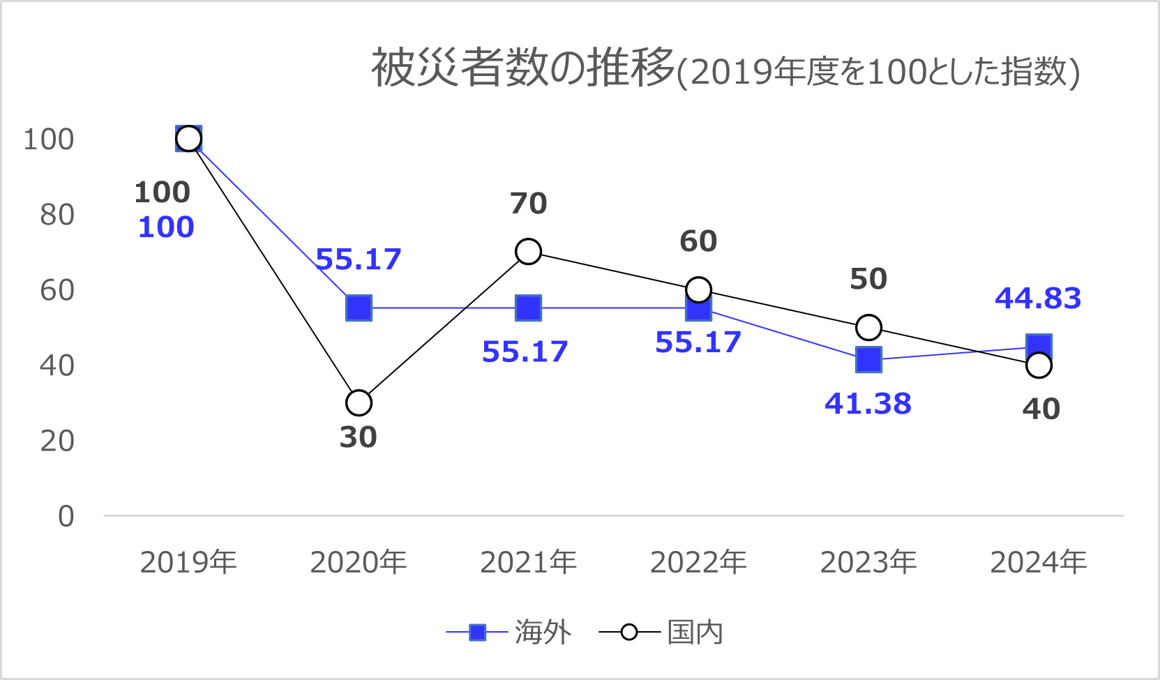 当社の災害被災者数は2019年度をピークに減少傾向にありますが、2024年度の被災者数は国内4人、海外13人 合計17人となり、23年度と横ばいでした。