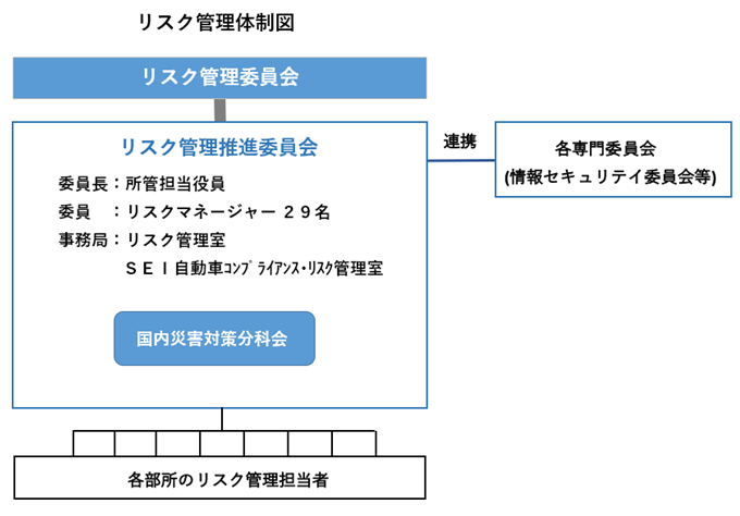 住友電装はリスク管理を推進するにあたり、リスク管理室を事務局とする「リスク管理委員会」とその下に「リスク管理推進委員会」を設置しています。推進役として、各部門・国内製造グループ会社にリスクマネージャー、各部所にリスク管理担当者を選任しています。