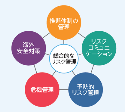 全社的なリスク管理体制として、リスク管理活動の5本柱(推進体制の管理、リスクコミュニケーション、予防的リスク管理、危機管理、海外安全対策)を定めて総合的なリスク管理活動を推進しています。