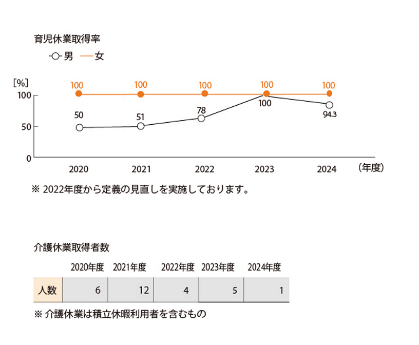誰もが気兼ねなく育児休業を取得できる会社を目指し、性別に関わらず、1週間以上の育児休業取得100% をめざして取組みを行っています。育児休業の取得率は、2023年は男女共に取得率100%、2024年度は女性100%・男性94.3%となりました。
