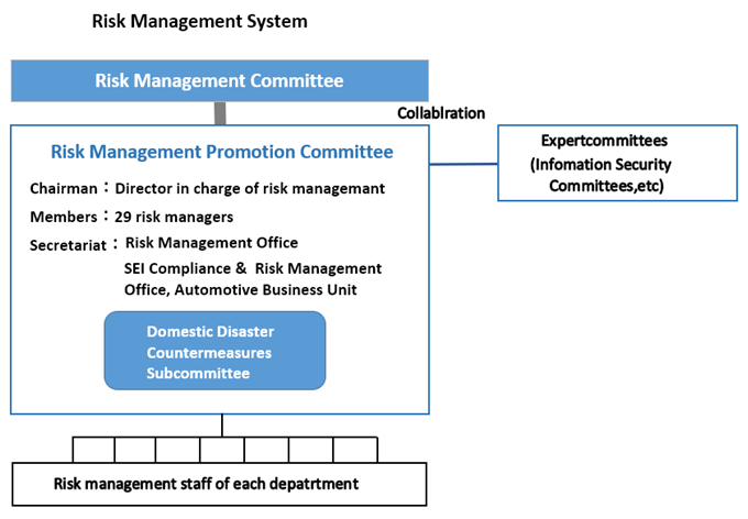 From fiscal 2023, SEI Compliance & Risk Management Office, Automotive Business Unit will be added as the secretariat to promote risk management across the entire business. Additionally, under the Risk Management Promotion Committee, a "Domestic Disaster Countermeasures Subcommittee" has been established to strengthen natural disaster countermeasures. Furthermore, as part of BCP(*1), efforts are being made to enhance global supply chain countermeasures.